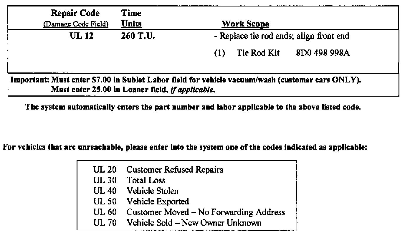 Section 154(d) of the National Traffic and Motor Vehicle Safety Act of 1966 mandates that dealers correct, prior to delivery for sale or lease, any vehicle which falls to comply with an applicable Federal Motor Vehicle Safety Standard or which contains a defect relating to motor vehicle safety. It is, therefore, imperative that any vehicle in your dealer new or used car inventory, and showing the UL code in the OTIS system, is updated with replacement of the tie rods prior to sale.