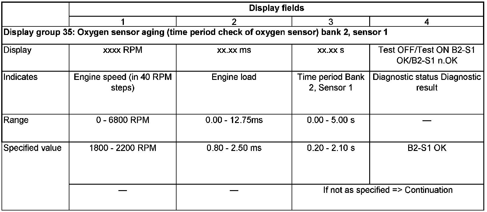 - Maintain engine speed at 1800-2200 RPM and compare display with specified values for O2S aging (before TWC) in display fields 3 and 4).