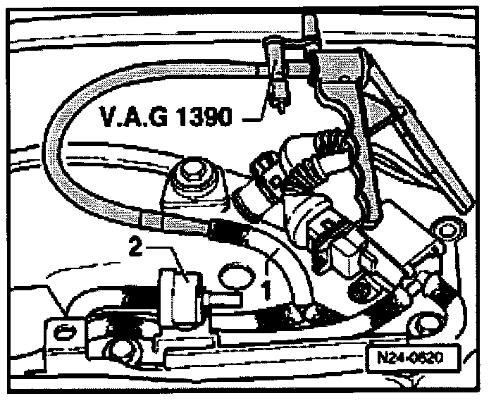 - Disconnect vacuum hose -1- from one- way valve -2- and connect VAG1390 hand pump to disconnected hose.