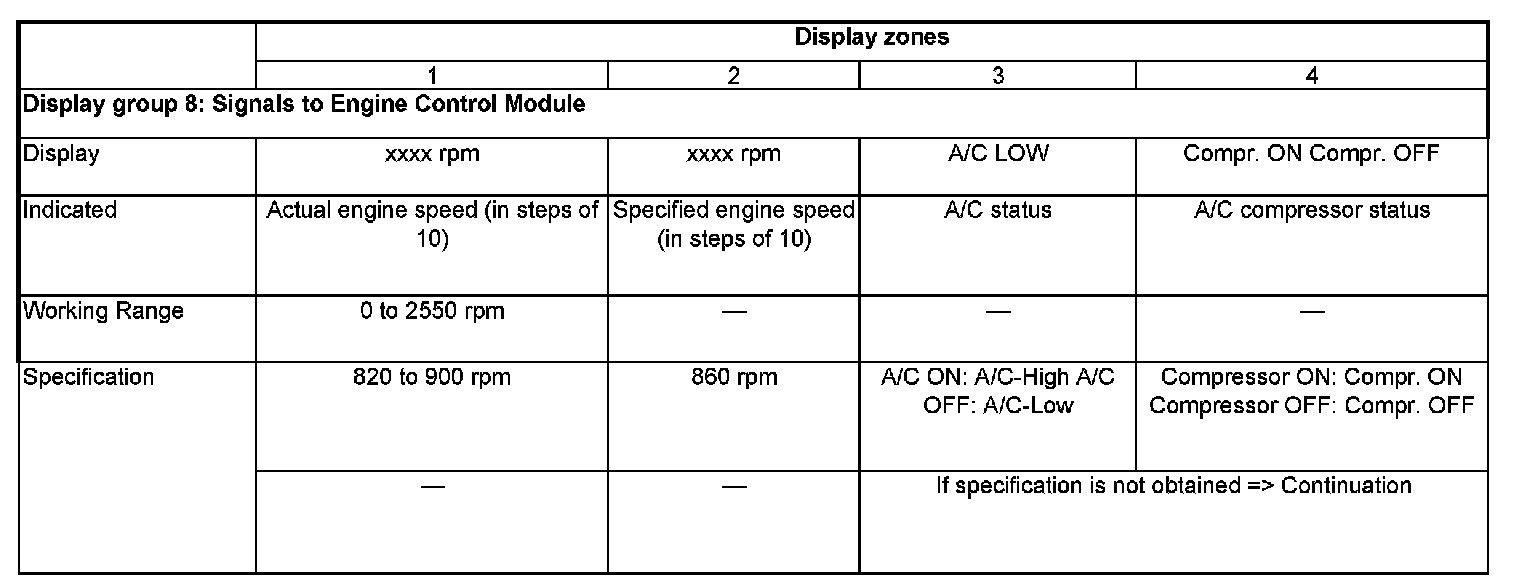 When quickly pressing the accelerator pedal down the Display in Display zone 4 must change from "ON" to "OFF" for a few seconds (compressor cut-off under vehicle acceleration).