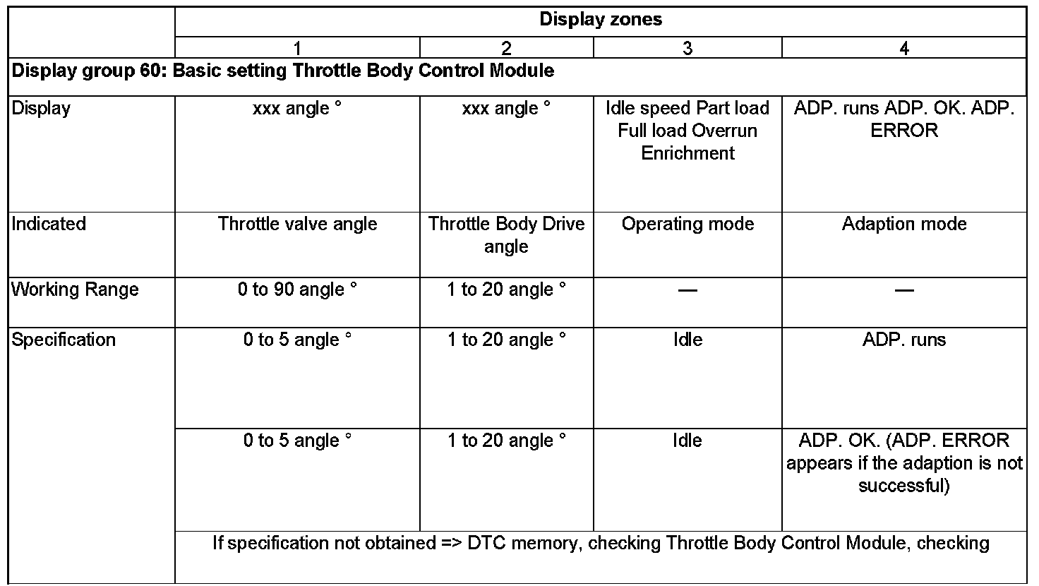 - After confirming Display group 60 the adaption is introduced and the Throttle Body Drive is moved to min. max. and emergency running positions. Then using intermediate steps, a comparison is made between Throttle Position sensor G69 and Throttle Body Drive angle sensor G187.