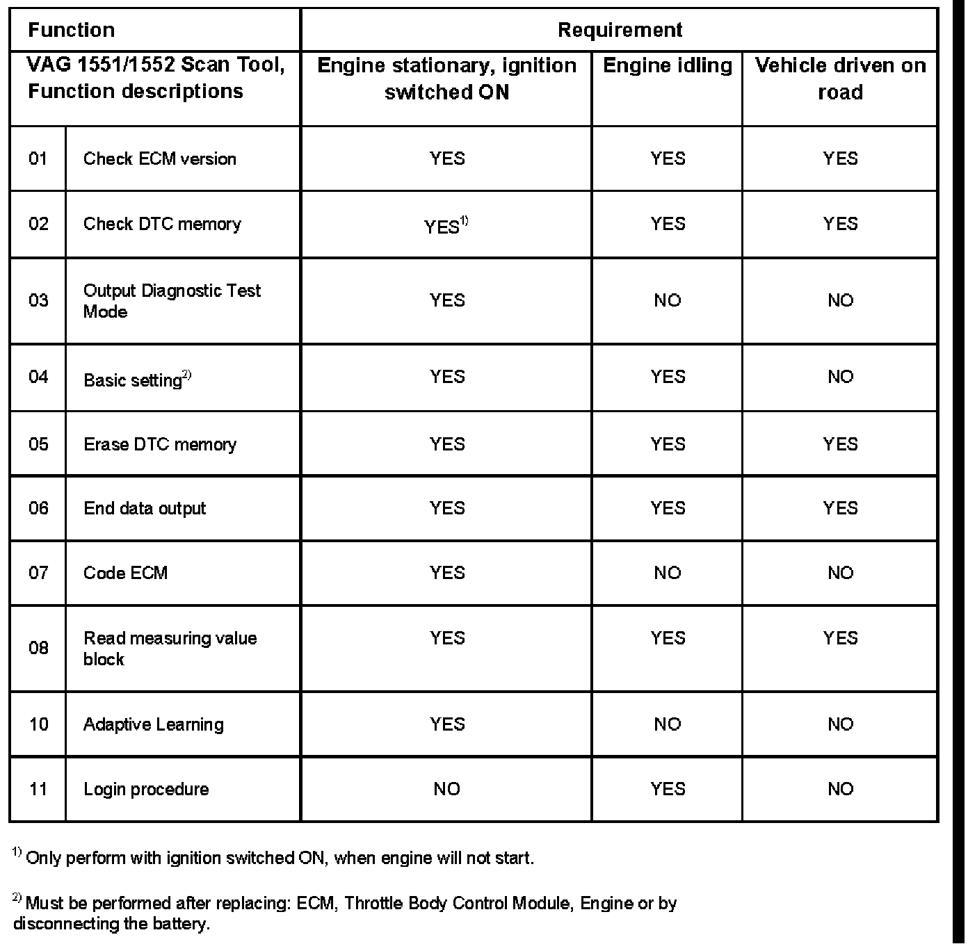 Selectable Functions When Using VAG1551/1552 or VAS5051
