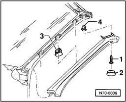 - Unclip clips - 3 - from A-pillar and insert into trim.