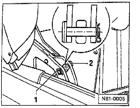 - Remove circlip -1- from hydraulic cylinder/gas-filled strut pin -2-. Take pin out and remove hydraulic cylinder/gas-filled strut from convertible top frame.