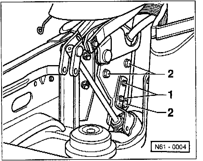 - Remove bolts with washers -1- from hydraulic cylinder/gas-filled strut retainer.