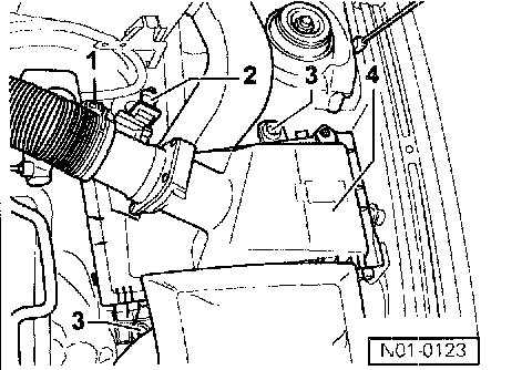 - Release spring clip -1-on air duct hose with pliers VAG 1921 and pull hose off air cleaner cover -A-.
