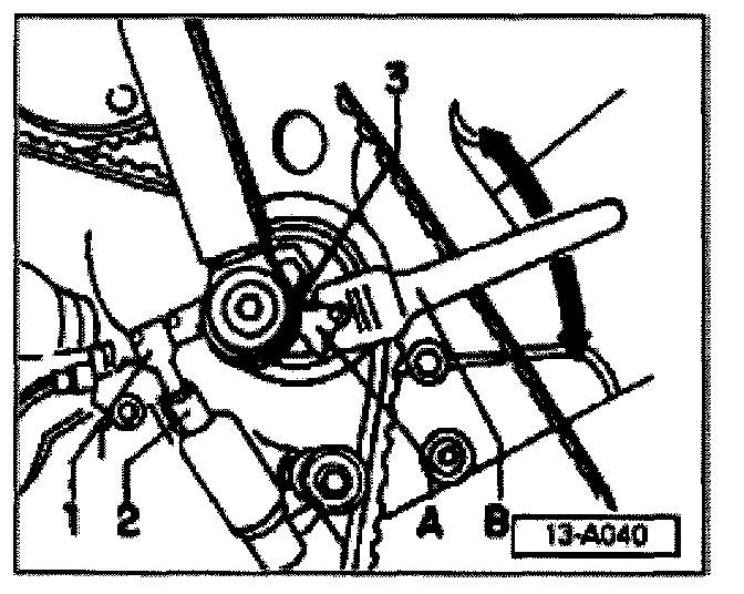 - Turn tension roller to the right using two-pin spanner -B-, with one pin inserted in hole in roller and other pin in slot at bottom of roller pivot bracket until: