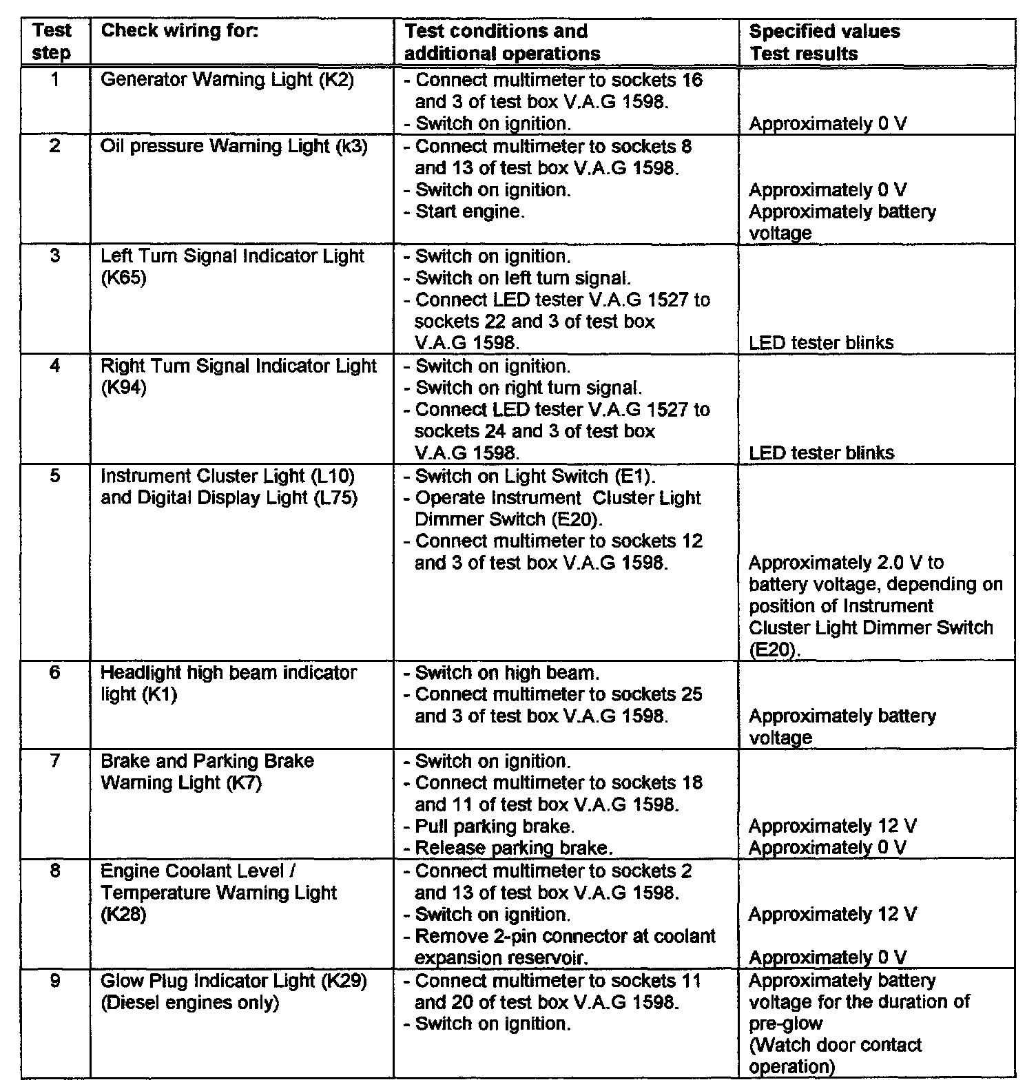 - The socket identifications on the test box VA. G 1598 are the same as the contact identification on the instrument cluster.