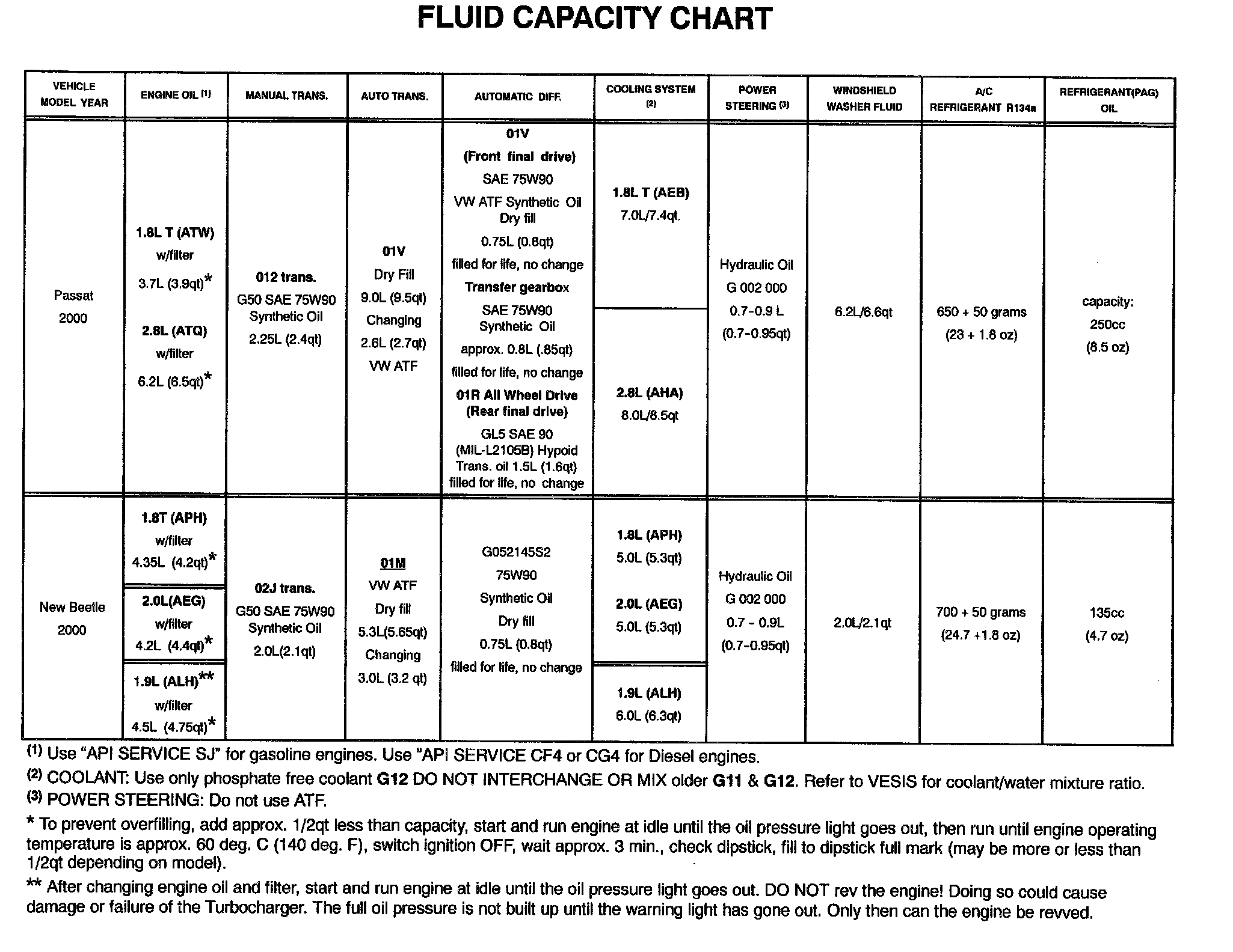 The following fluid capacity chart applies to 2000 model year vehicles.