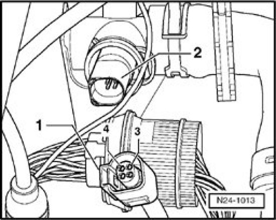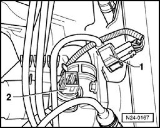 - Disconnect 4-pin connector -1- from Engine Coolant Temperature (ECT) Sensor -G62- with Engine Coolant Temperature (ECT) Sensor -G2- (-2-).
