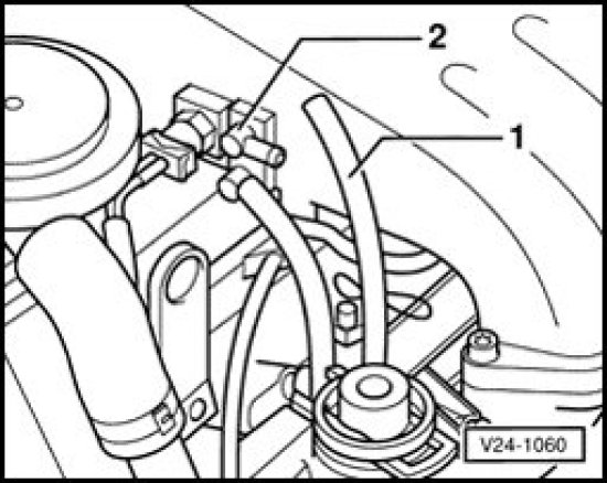 - Disconnect vacuum hose -1- from connecting piece -2-. Fuel pressure should rise to approx. 3.0 bar positive pressure rise.