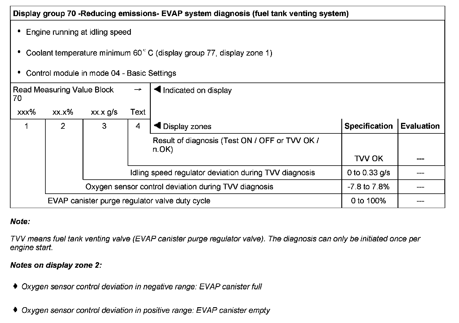 Display group 70 -Reducing emissions- EVAP system diagnosis (fuel tank venting system)