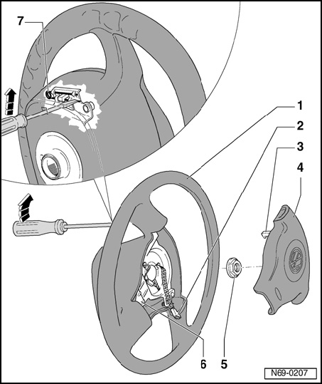 - Insert a screwdriver of approx. 175 mm length into bore of steering wheel pan from rear (insert screwdriver approx. 45 mm).