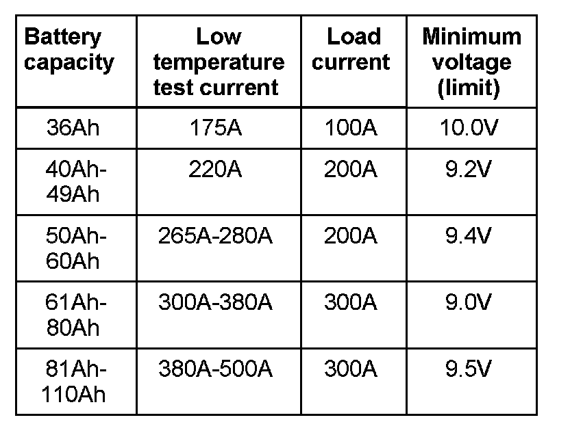 The load current to be applied varies according to battery capacity see battery tester operating instructions or refer to table below.