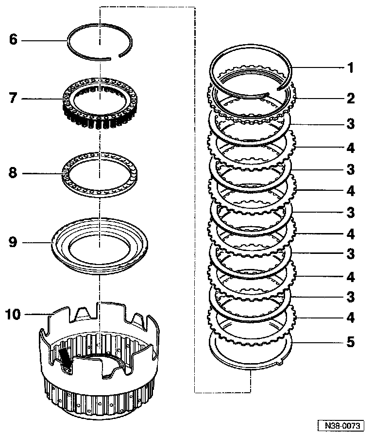 Circlip (arrow) must be seated in groove of clutch housing. Spring supporting plate must be centered relative to hub.