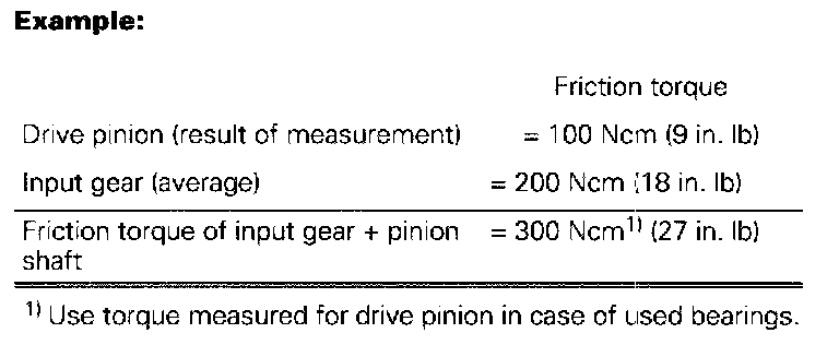 Friction torque of new bearings must be 60 - 80 Nm (5 - 7 inch lbs.) greater than at drive pinion.