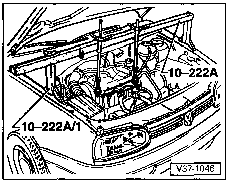- Install support bar 10-222A with legs 10-222 A/1 (adapter 10-222 A/3 for 6-cyl. engine) and support engine/transmission in position.