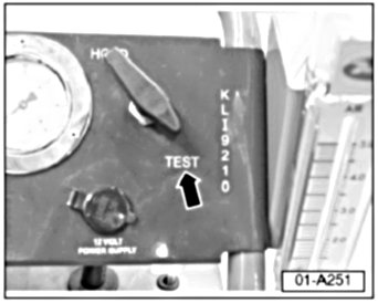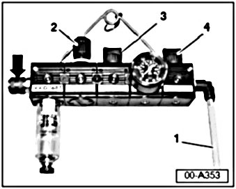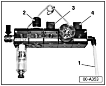 - With outlet hose -1- of VAG 1687 connected to air pressure adapter.