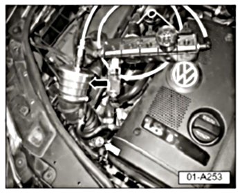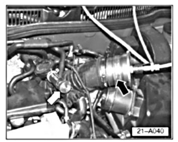 - Remove crankcase ventilation valve or tube from intake hose at -white arrow-.