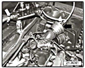 - Insert VAG 1687/1 pressure adapter in intake hose -black arrow- using existing clamp (as shown).