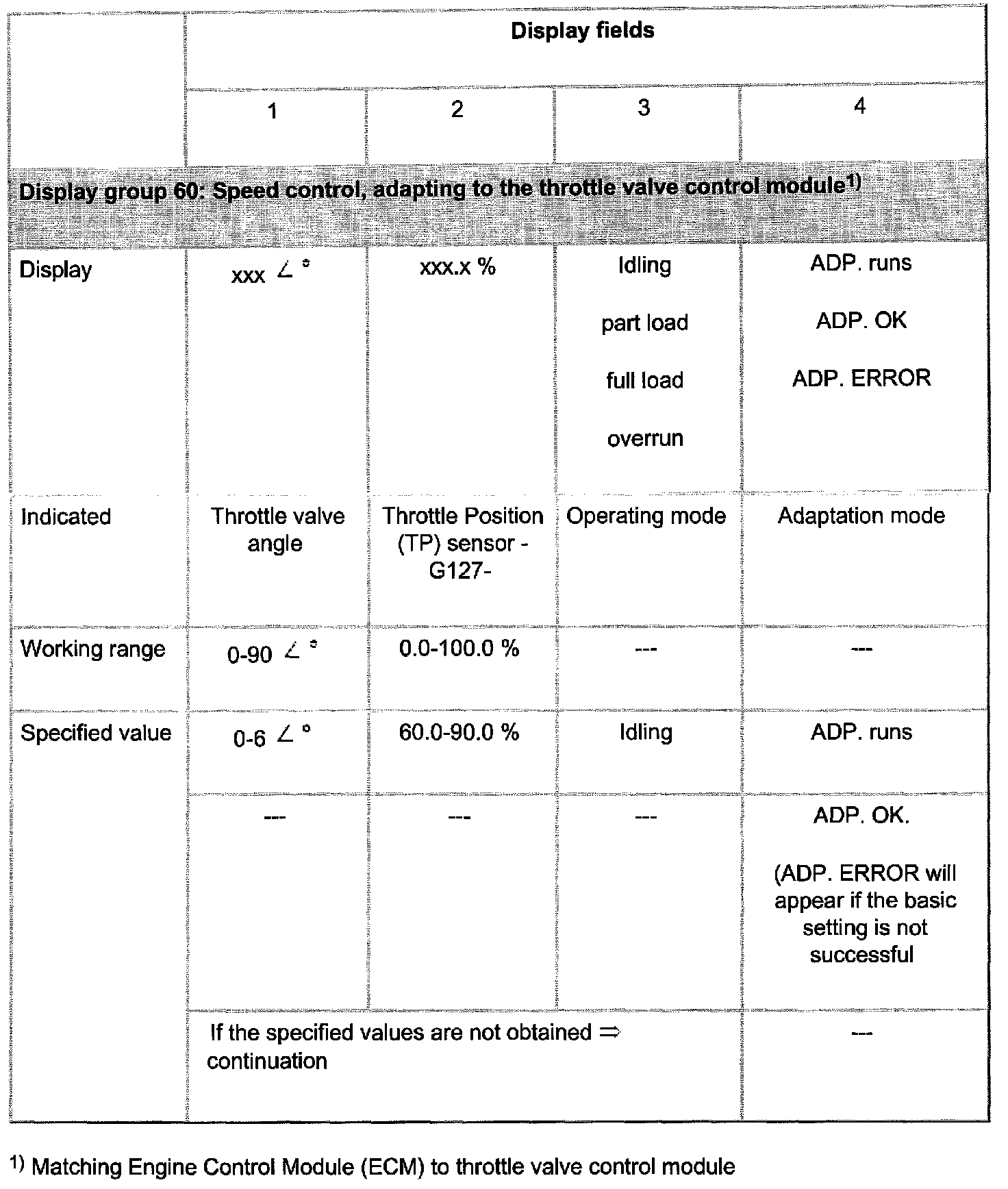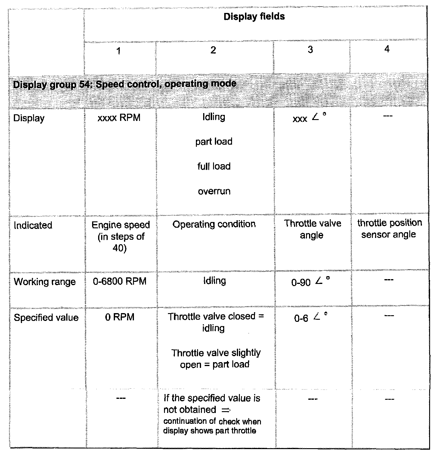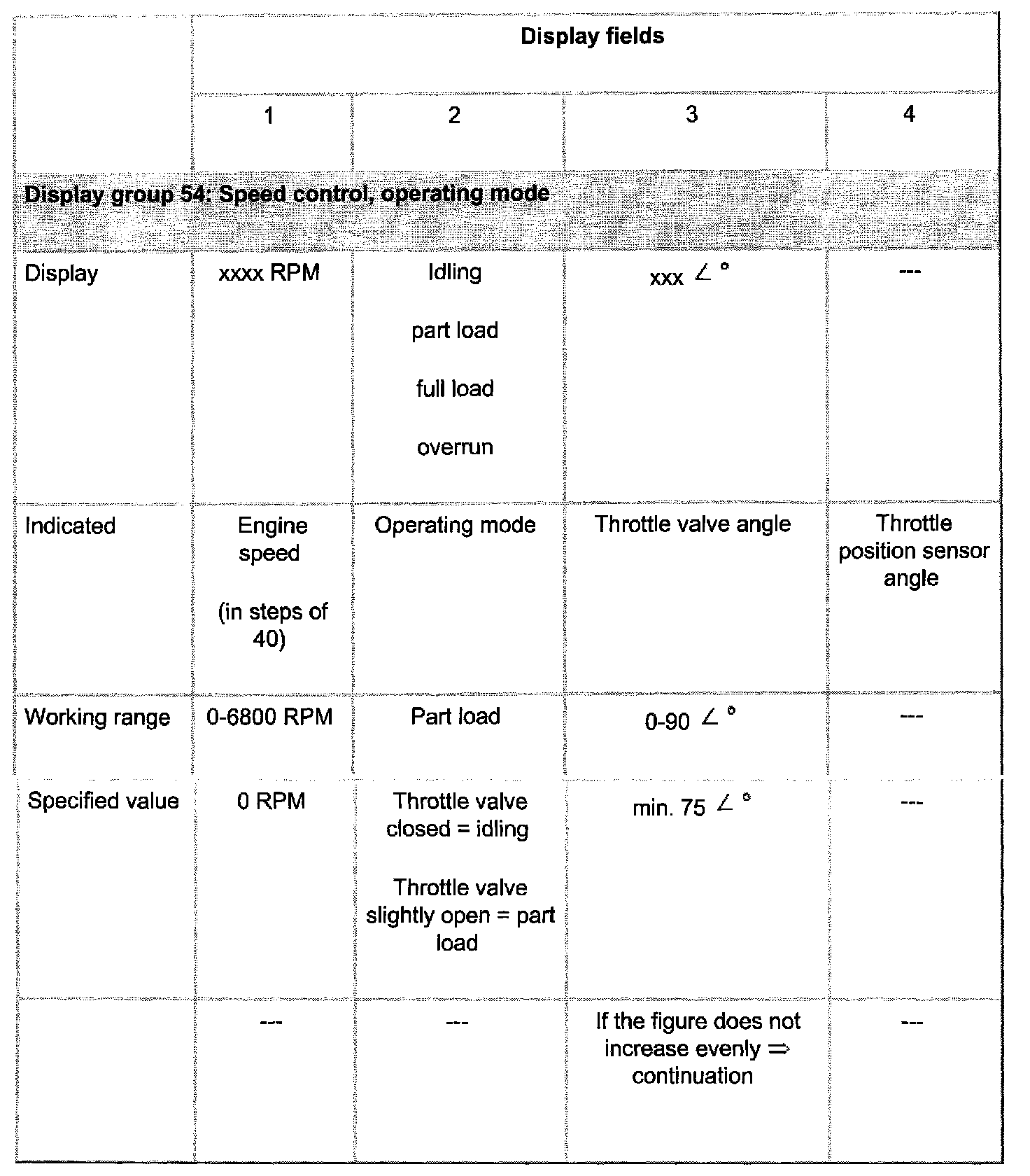 - Slowly open throttle valve fully and observe angle display in display field 3. Figure must increase uniformly over complete range.
