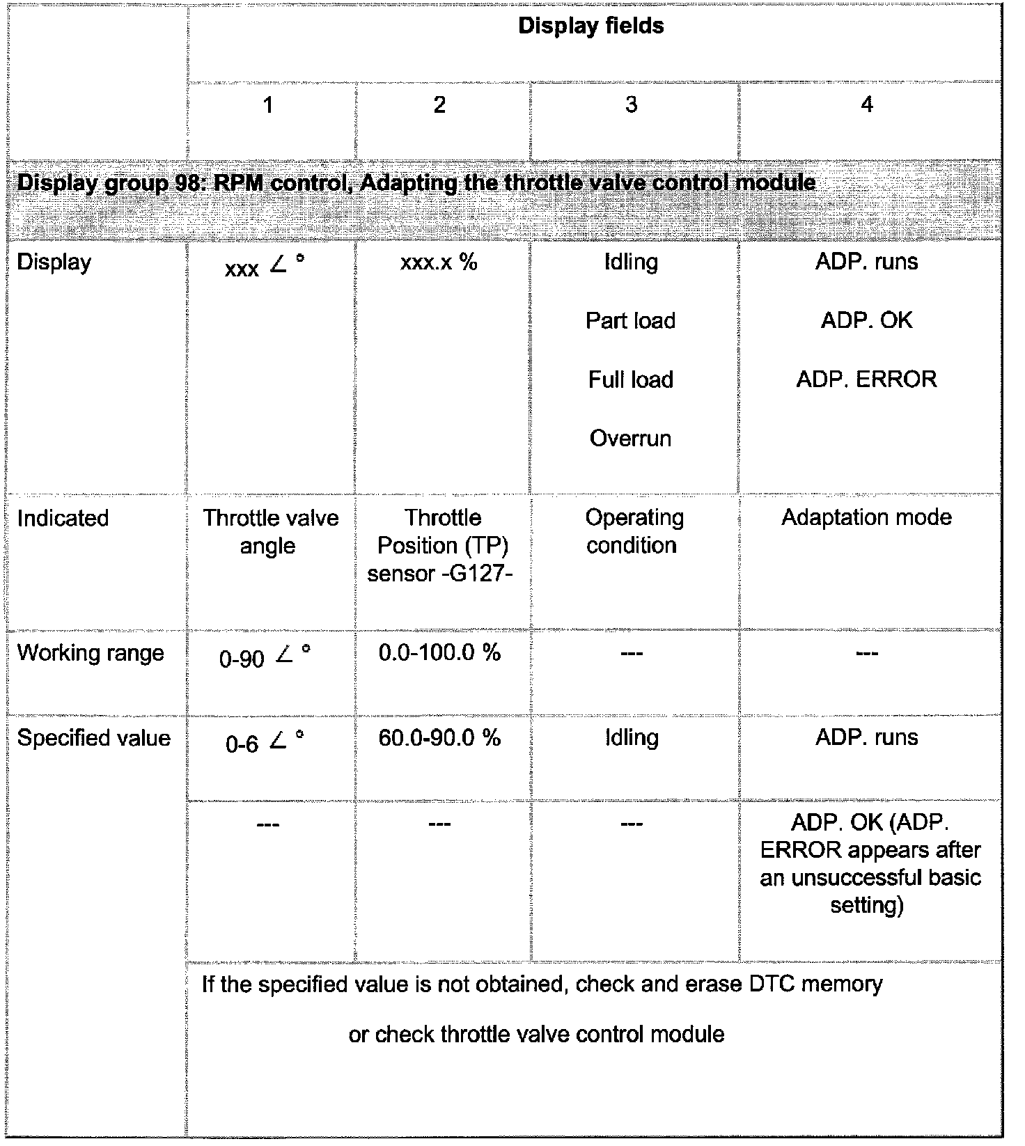 Adaptation teaches the Engine Control Module (ECM) (with ignition turned on and engine not running) the throttle valve control module stop positions and a comparison graph between throttle valve potentiometer and throttle position sensor.