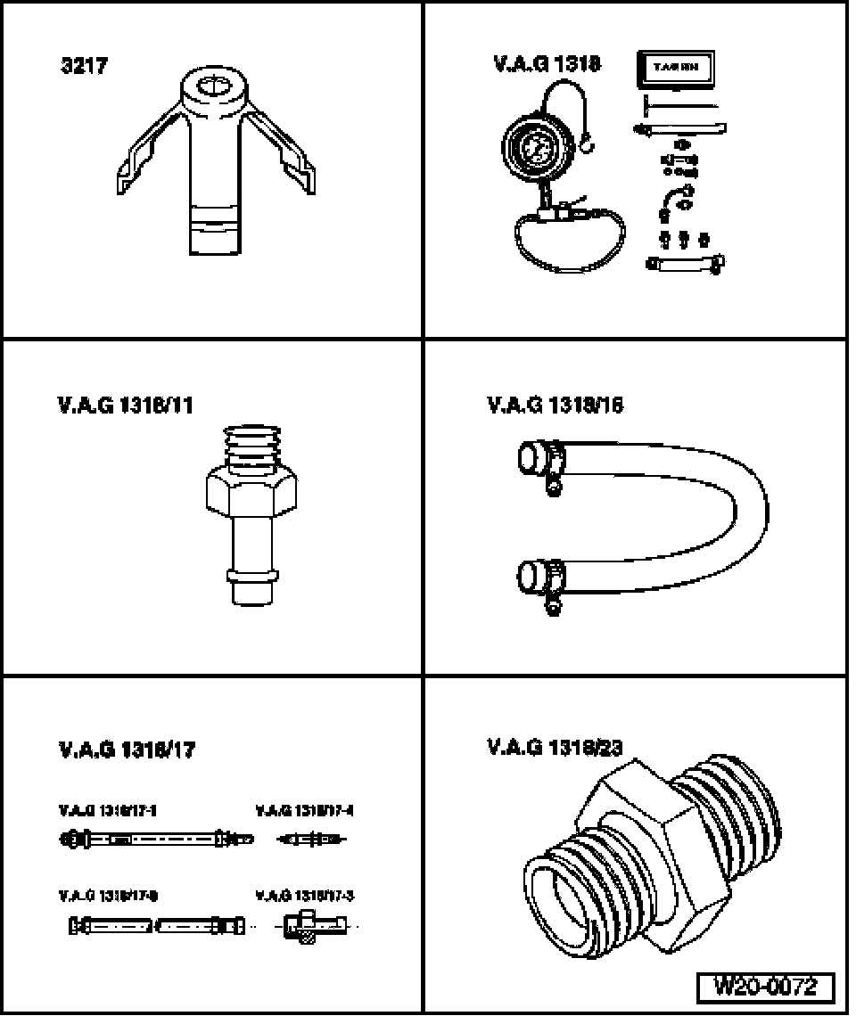 - Connect pressure gauge (VAG1318) with adapter (1318/17) to hose.
