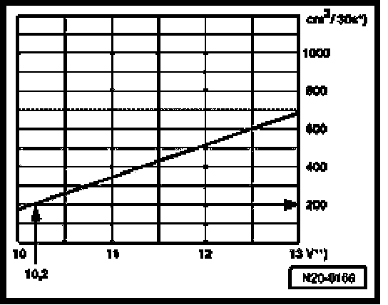 During test, a voltage of 12.2 volts is measured at battery. Since the voltage at the pump is approx. 2 volts less than battery voltage, there is a minimum delivery rate of 200 cubic cm/30 s.