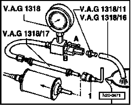 - Connect pressure gauge (VAG1318) to fuel supply line using adapters (VAG1318/23 and VAG1318/17).