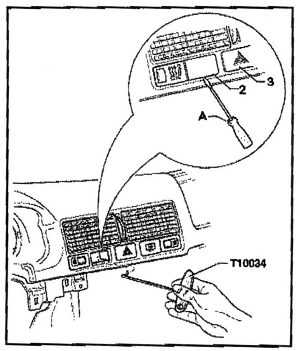 ^ Insert assembly tool T10034 into ESP or ASR switch opening, release the clip holding the emergency light switch -3- and pull it out of instrument panel.