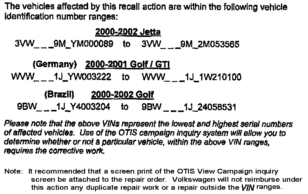 This is to inform you of the initiation of a safety recall involving some 2000-2002 model year Jetta, Golf and GTI vehicles.