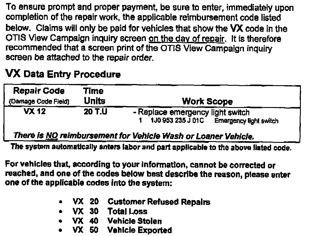 Volkswagen has found that, in some cases the hazard switch and flasher system function in affected vehicles may degrade over time because of distortion and material transfer of the contacts of certain hazard switch relays (which occurs due to substantially increased electrical current load from higher-wattage turn signal bulbs). This may result in intermittent or inoperative turn signal and hazard flasher function.