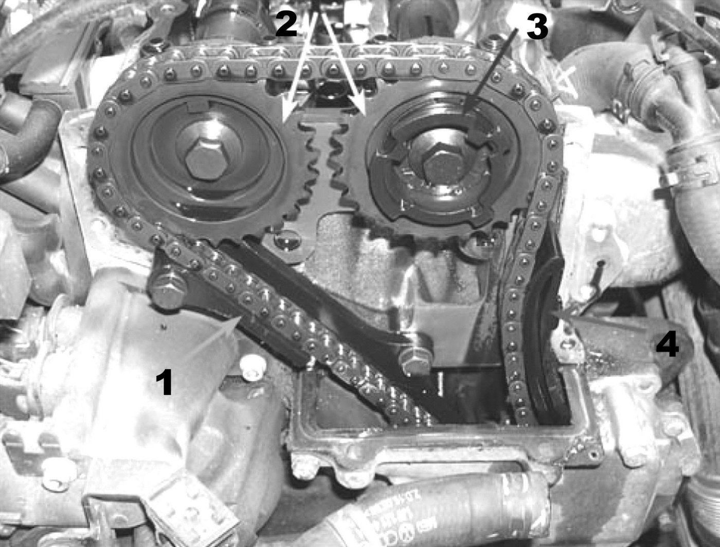 - Tighten sprockets 3 and 4 for intermediate shaft to 100 Nm.
