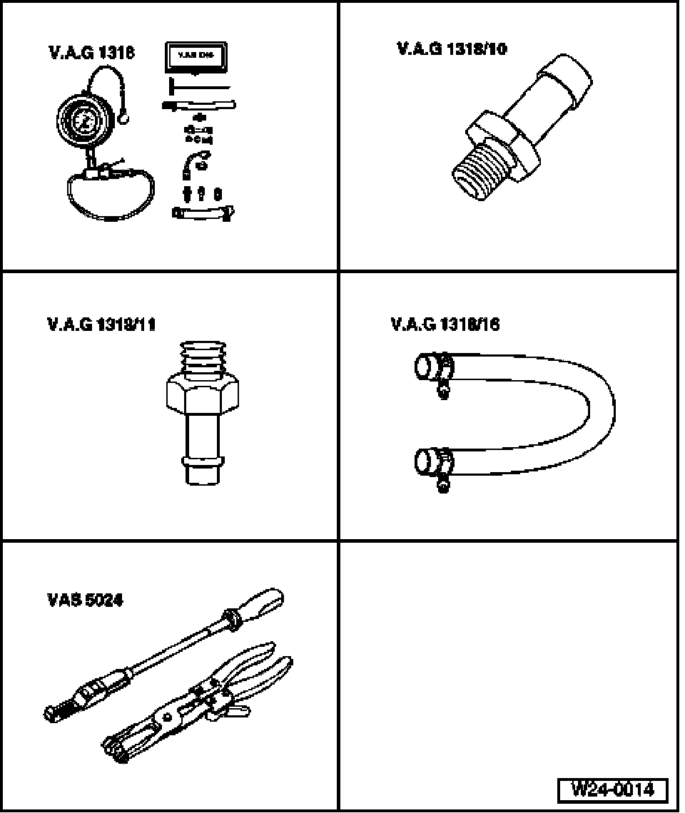 - Connect pressure gauge V.A.G 1318 to adapter V.A.G 1318/10 at supply hose and to adapter V.A.G 1318/11 and hose adapter V.A.G 1318/16 at supply line.
