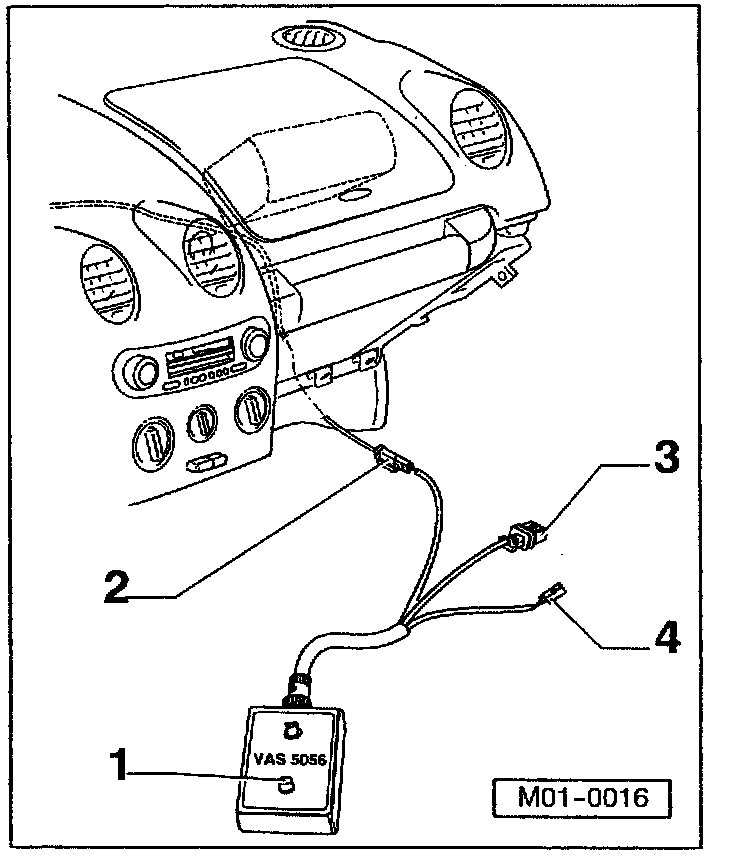 - Separate wiring harness to airbag unit and connect yellow 2-pin connector -2- from VAS 5056/1 to passenger airbag wiring harness.
