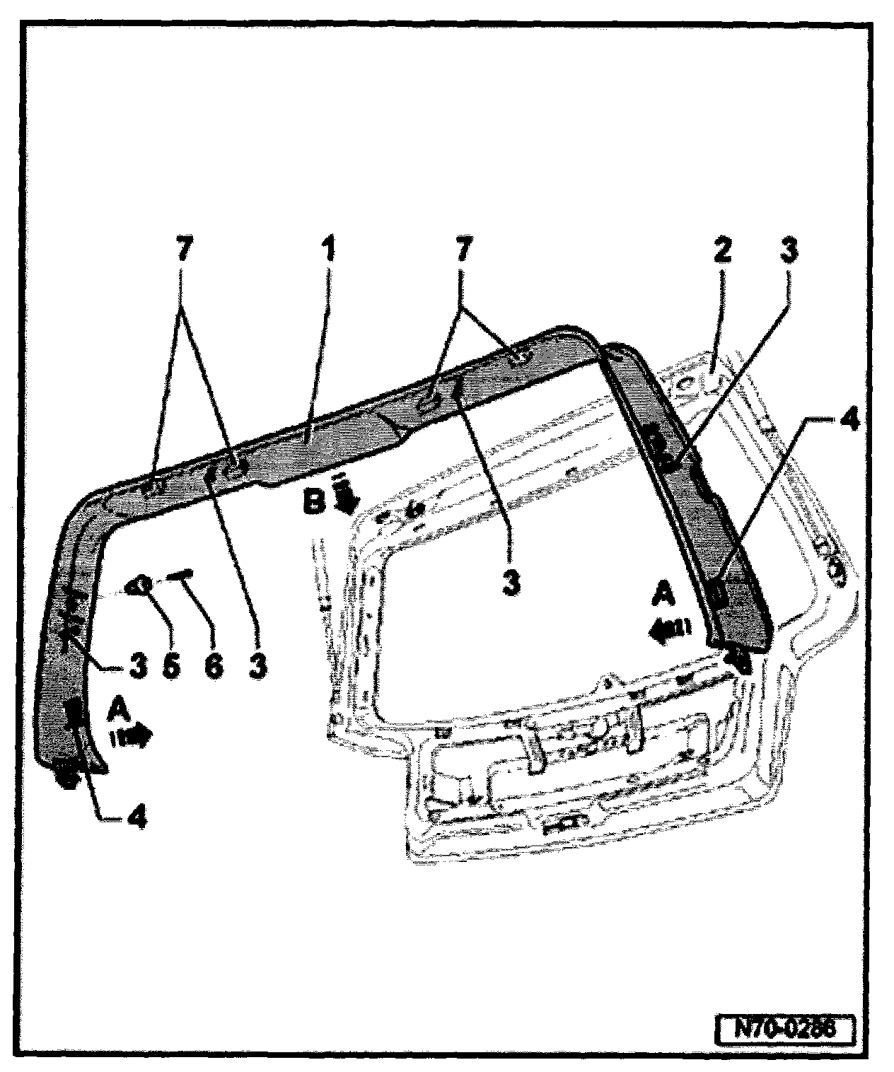 - Unclip trim -1- first along sides -arrow A- and then at top -arrow B-.