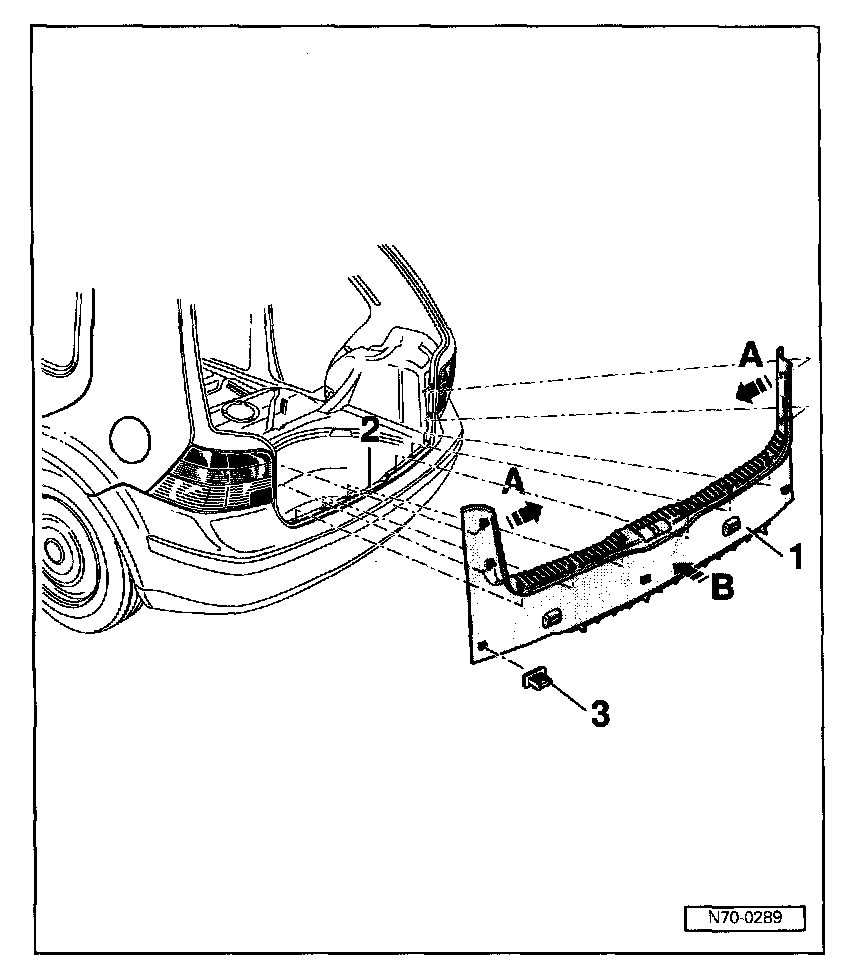 - Release lock carrier trim -1- from cross panel -2- first at top -arrow A- and then at bottom -arrow B-.