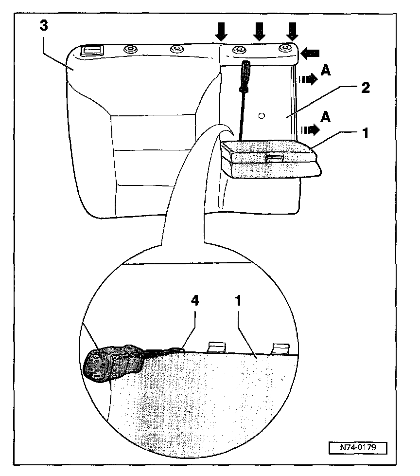 - Release trim -2- from retaining hooks -4- using screwdriver and pull out upwards.