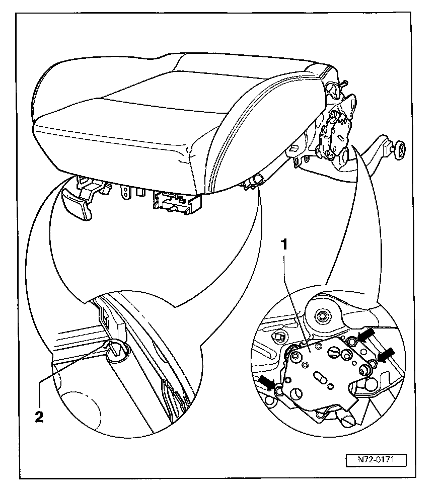 - Remove bolts -arrows- and pull seat height adjuster -1- out from seat frame.