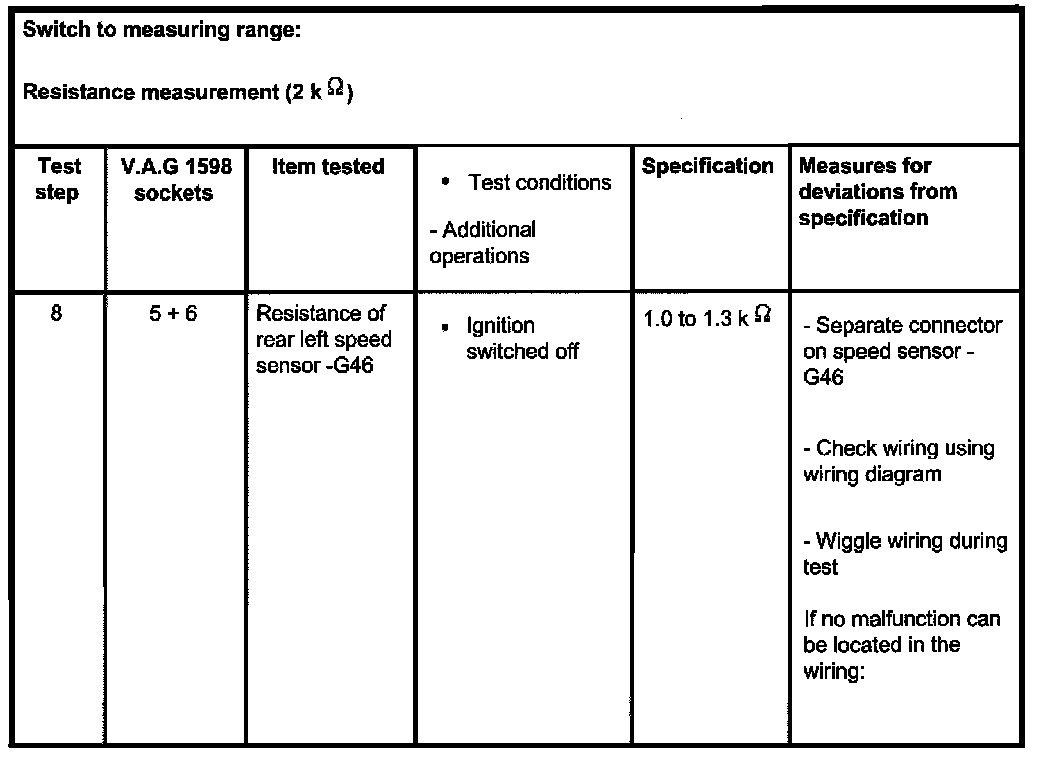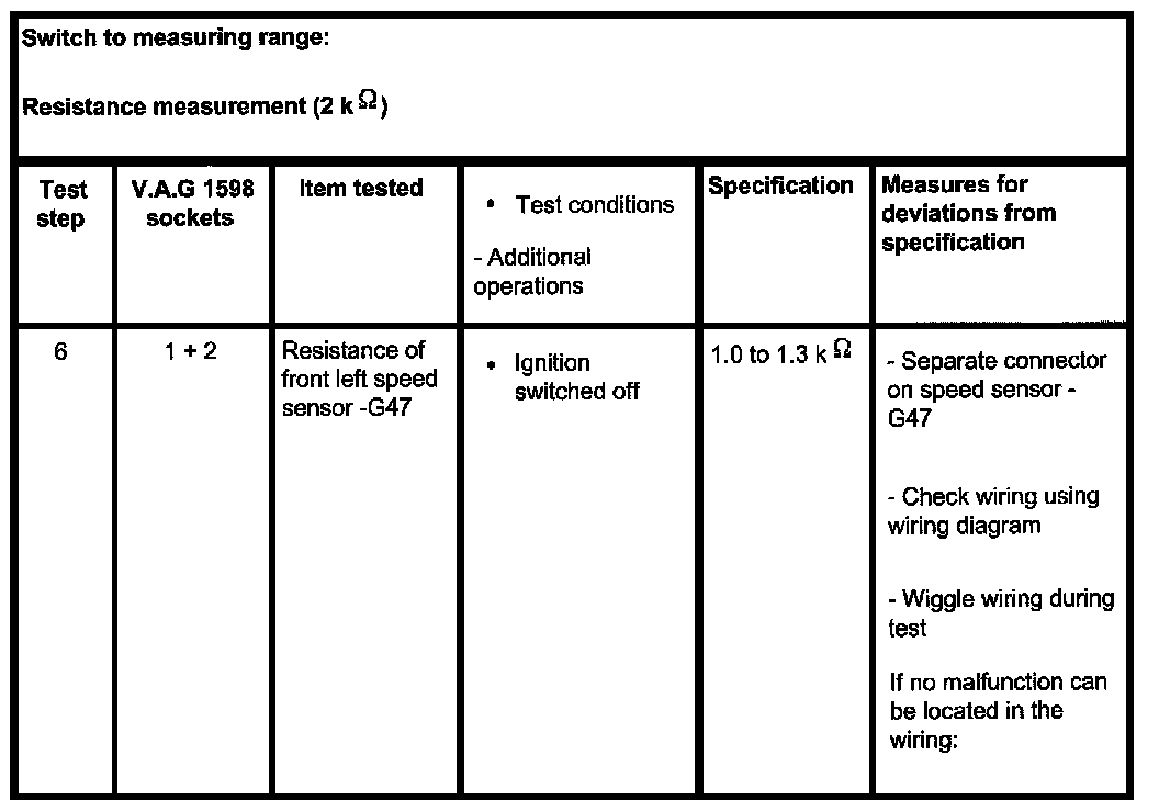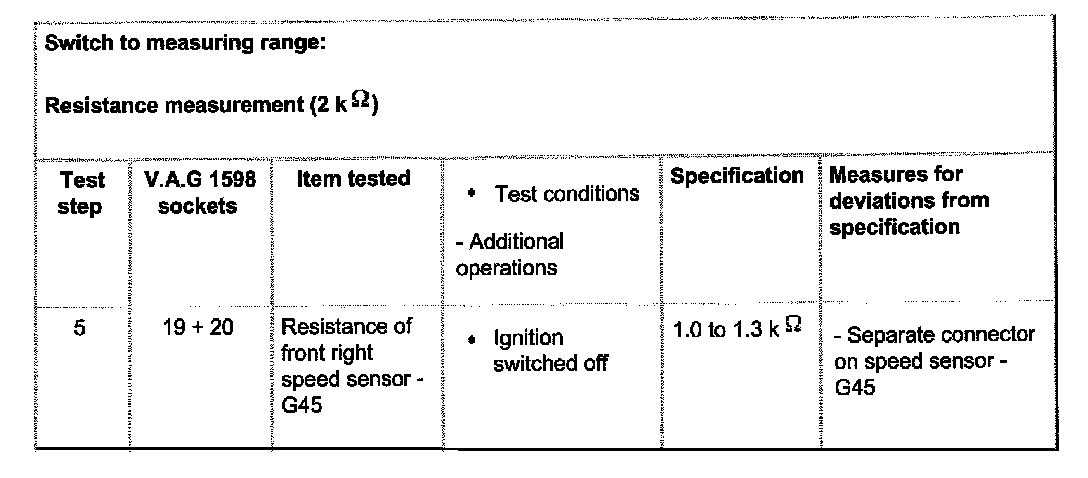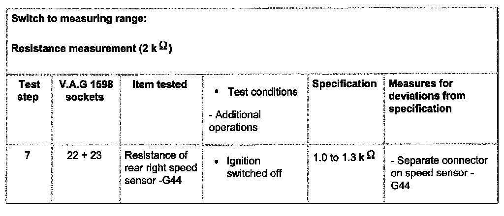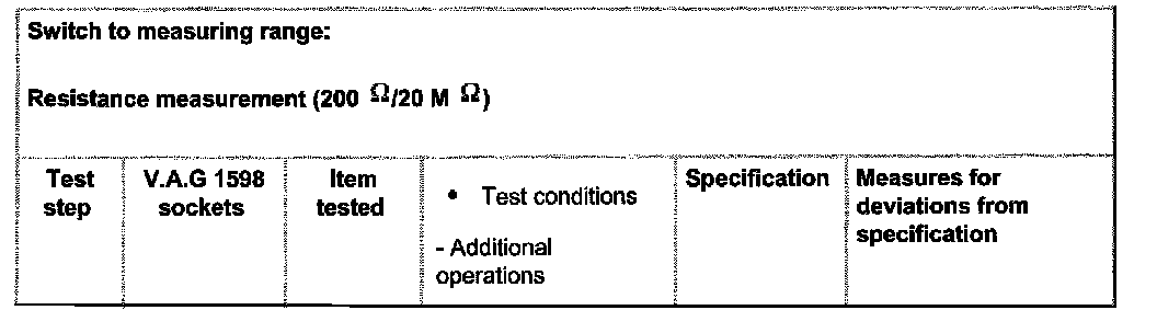^ If the measured figures only deviate slightly from the specifications, clean sockets and connectors of the testers and adapter cables (with contact spray G 000 700 04) and repeat check. Before replacing components, check wiring and connections and also, particularly for specifications of less than 10 ohms, repeat resistance check on the component.
