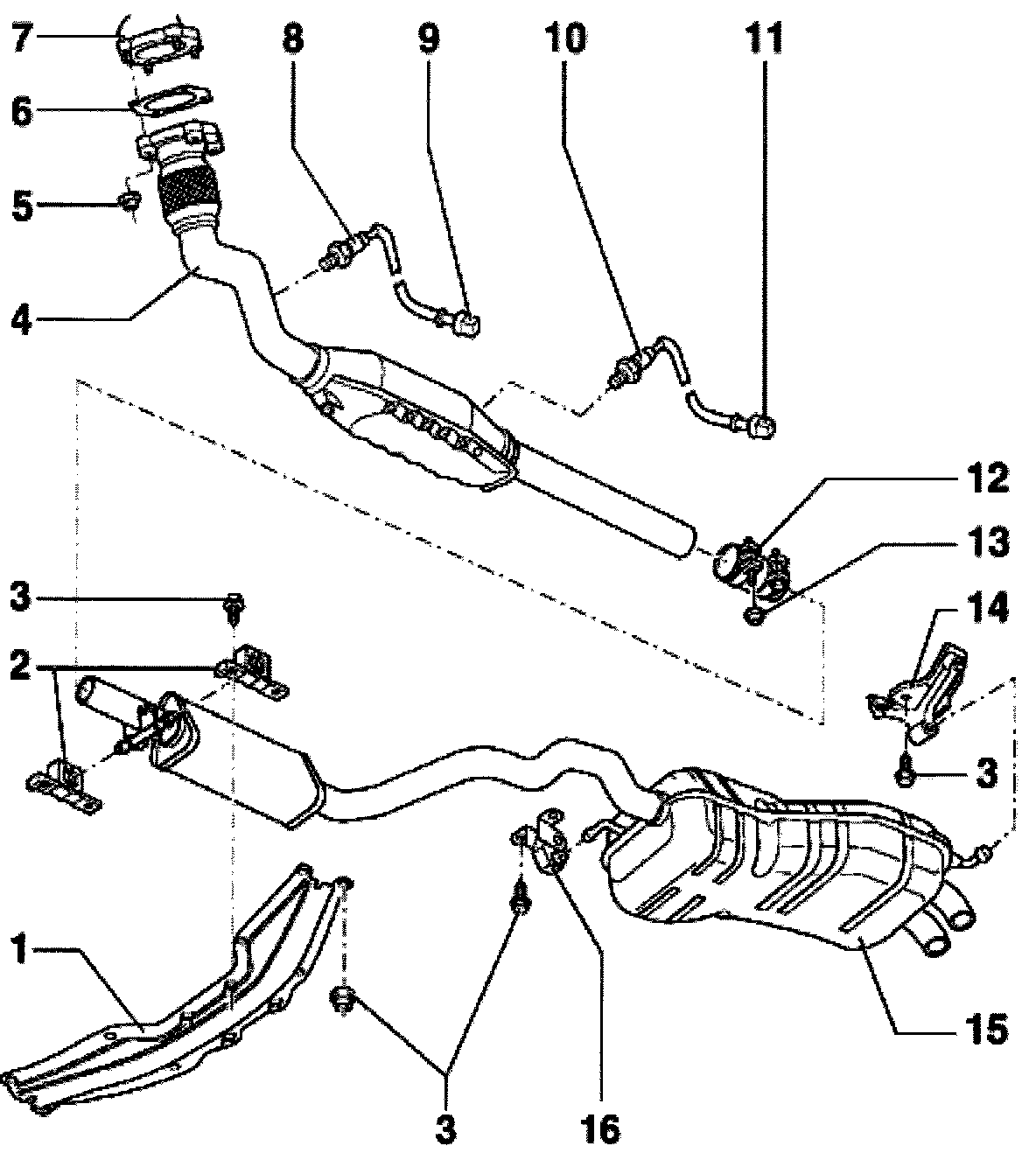^ As standard, center and rear silencers are installed as a single component. In cases of repair the center and rear silencer are supplied individually and with a double clamp for connecting.