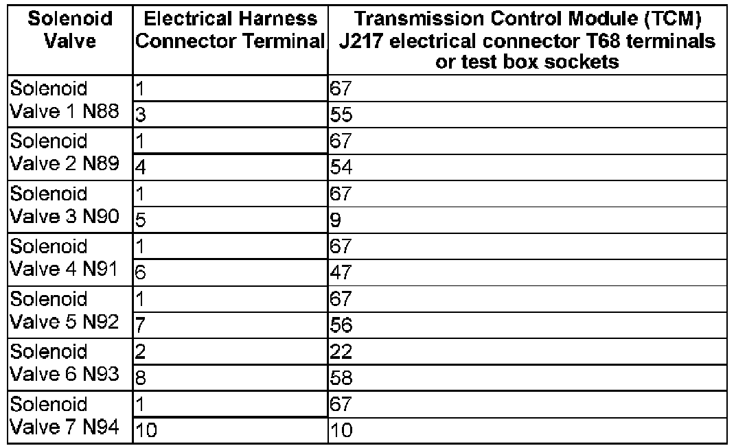 - Using a multimeter, check the Solenoid Valve electrical harness connector terminals to the Transmission Control Module (TCM) J217 electrical harness connector T68 terminals for an open circuit.