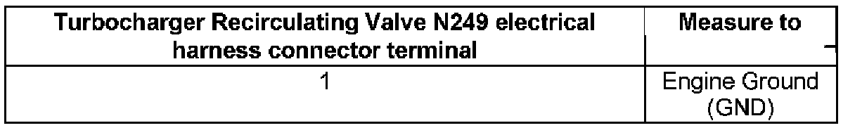 - Using a multimeter, check the Turbocharger Recirculating Valve N249 electrical harness connector terminal 1 to Ground (GND).