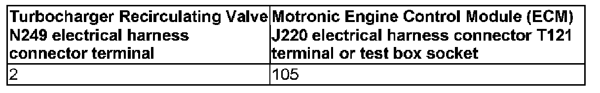 - Using a multimeter, check the Turbocharger Recirculating Valve N249 electrical harness connector terminal 2 to Motronic Engine Control Module (ECM) J220 electrical harness connector T121 terminal 105 for an open circuit.