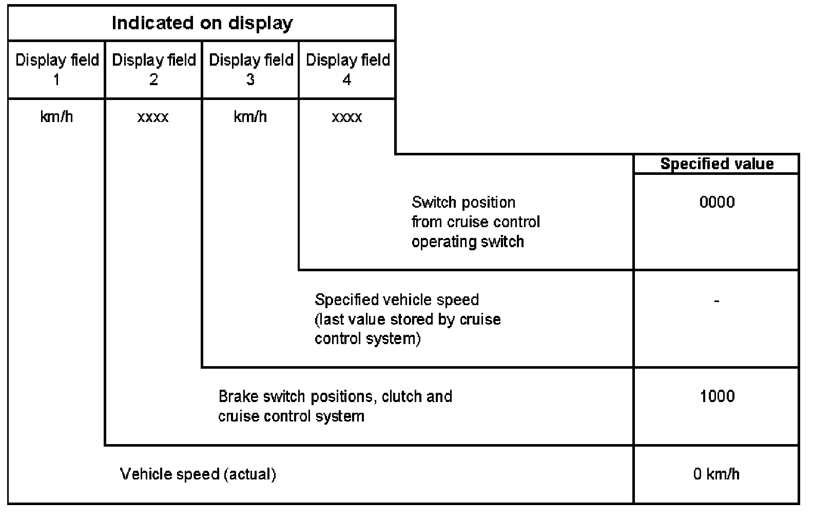 Explanation of digits in 4-digit indication, display field 2, switch for brakes, clutch and cruise control.