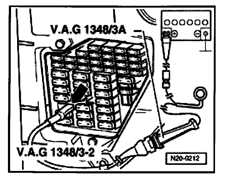 - Connect remote control V.A.G 1348/3A with adapter cable V.A.G 1348/3-2 to contact 28a to fuel pump and battery positive (+).