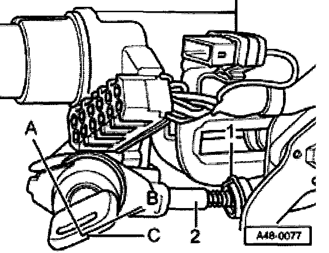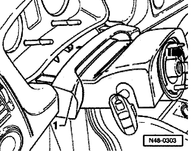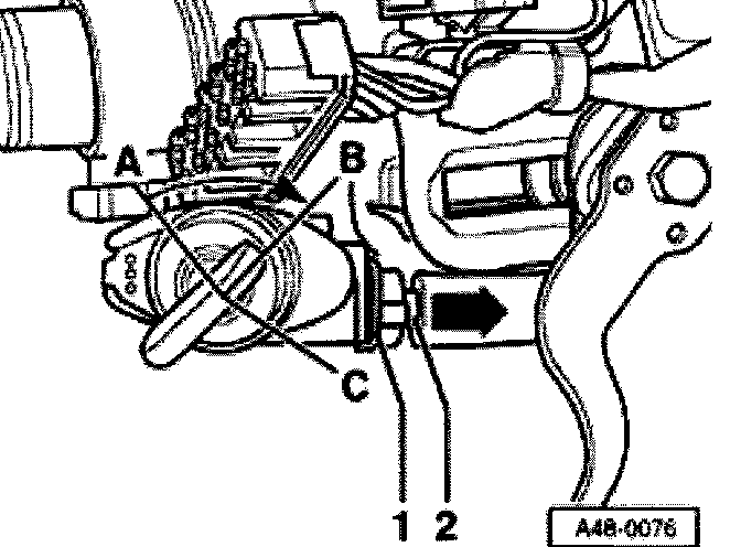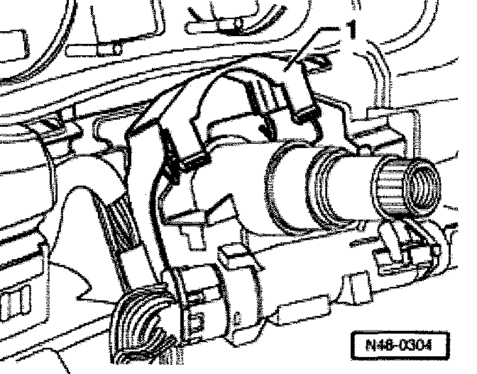 - Slide ignition lock cable -2- on steering lock housing -1- until wire clip -1- engages.