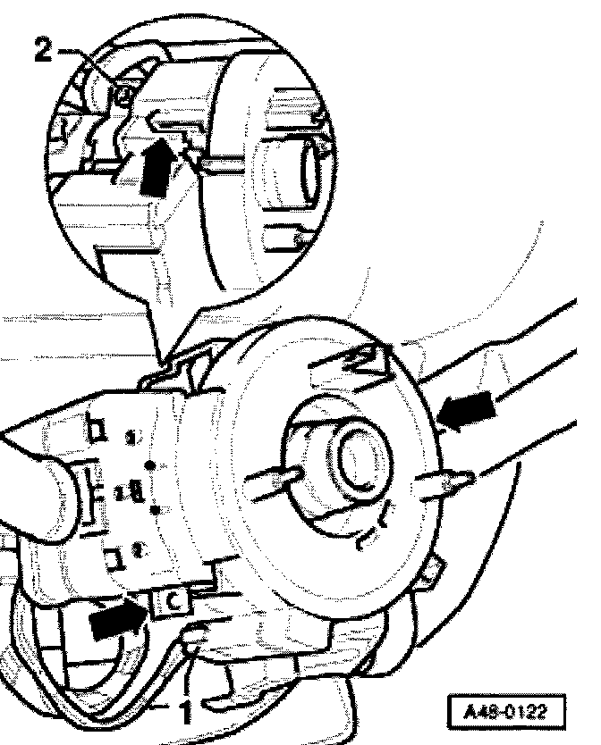 - Release locking tabs (arrows) and pull spiral spring with slip ring off steering column switch.