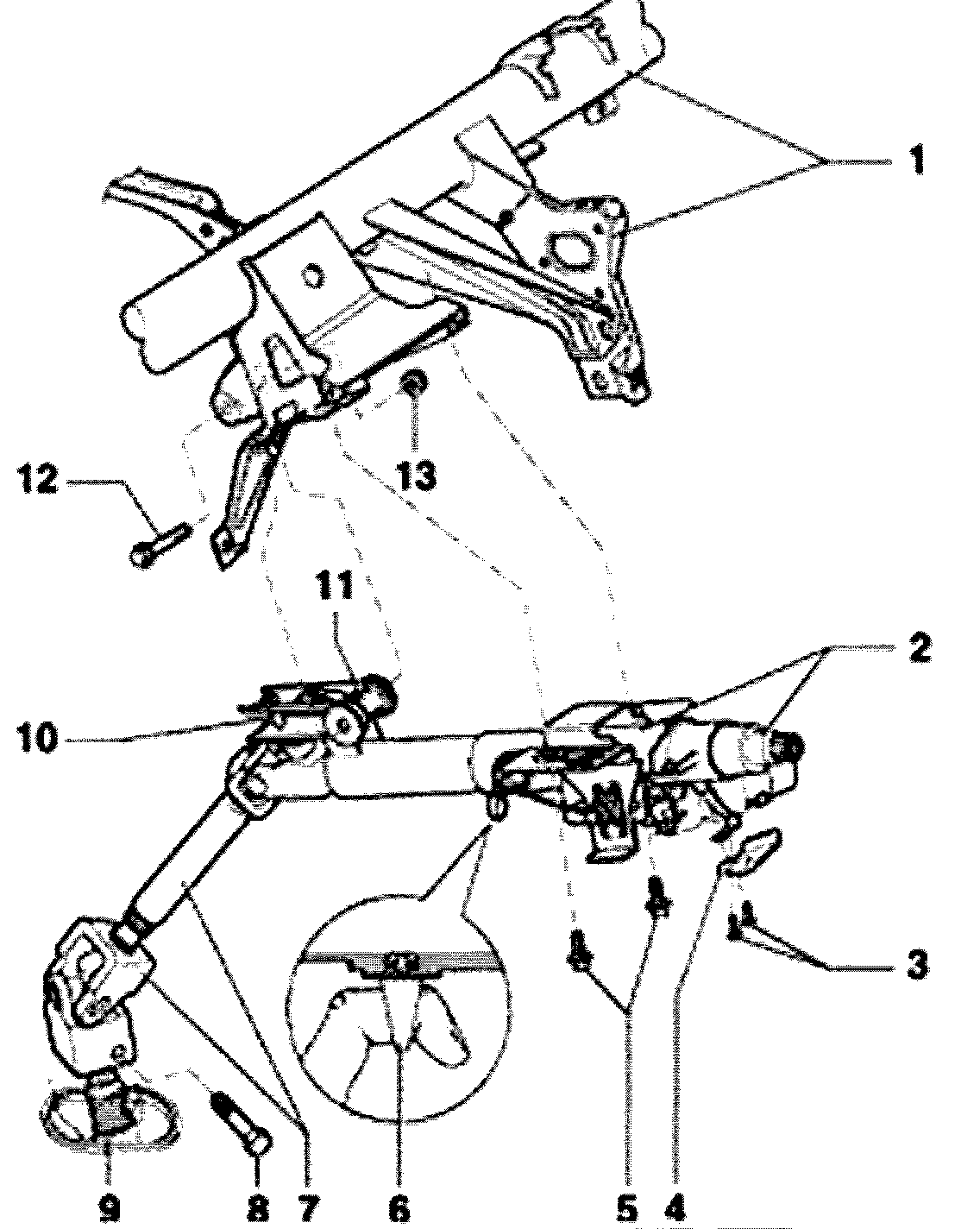 ^ New (replacement) steering columns, are secured with a transportation securing device -6-. This must be removed after installation.