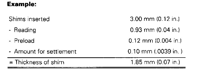 Specified bearing preload is achieved if reading (0.93 mm), bearing preload (0.12 mm), and compression amount (0.10 mm) are deducted from (2 x 1.5 mm thick) shims.